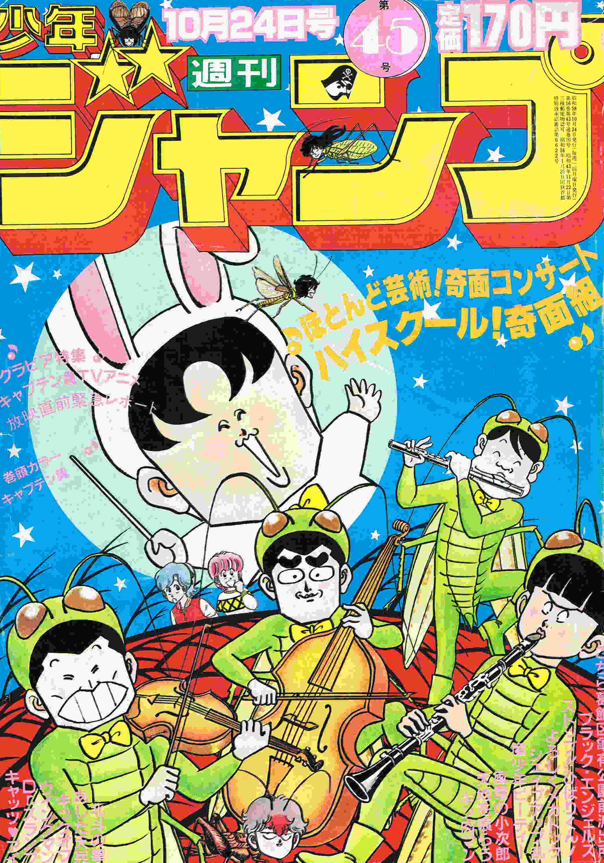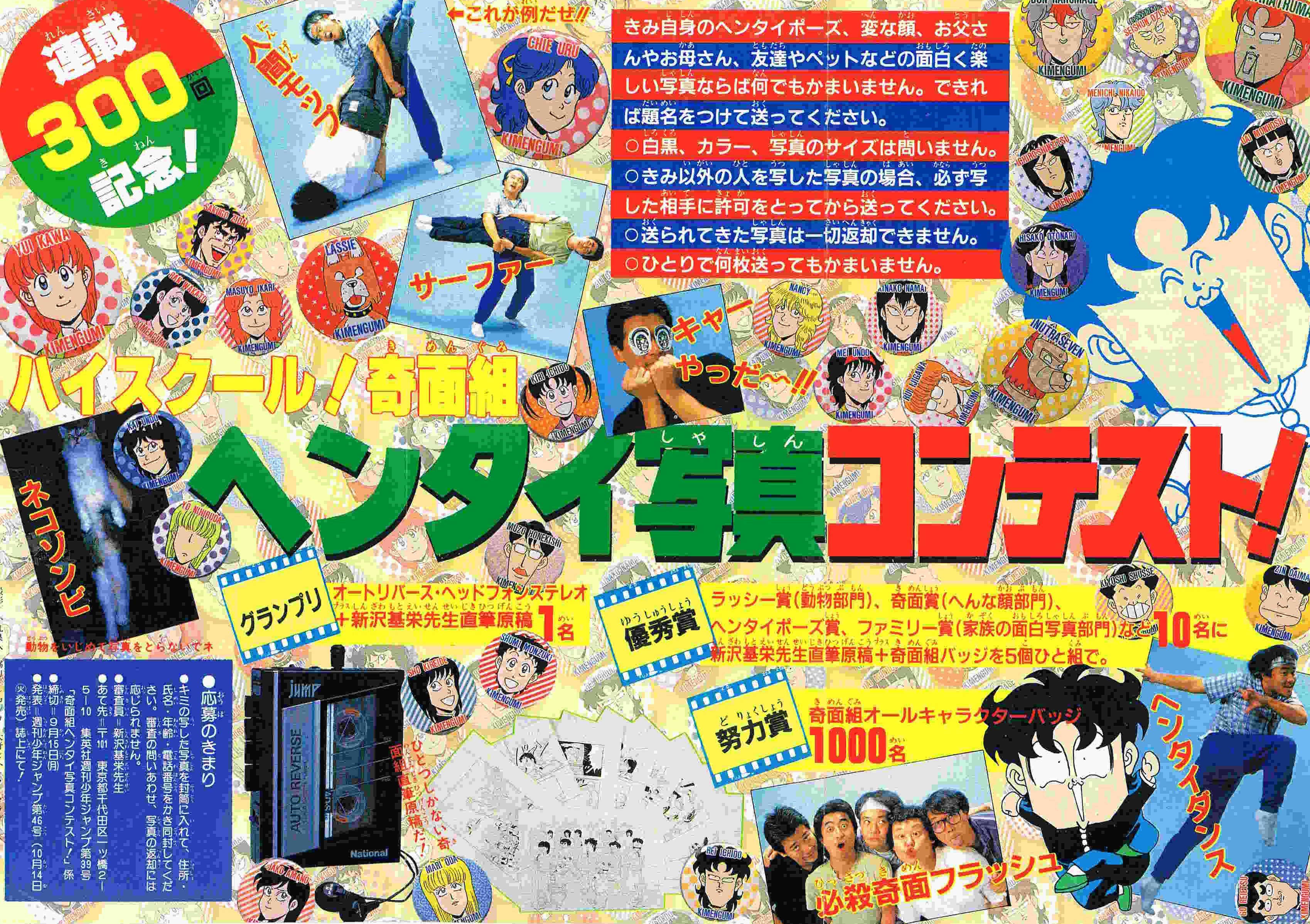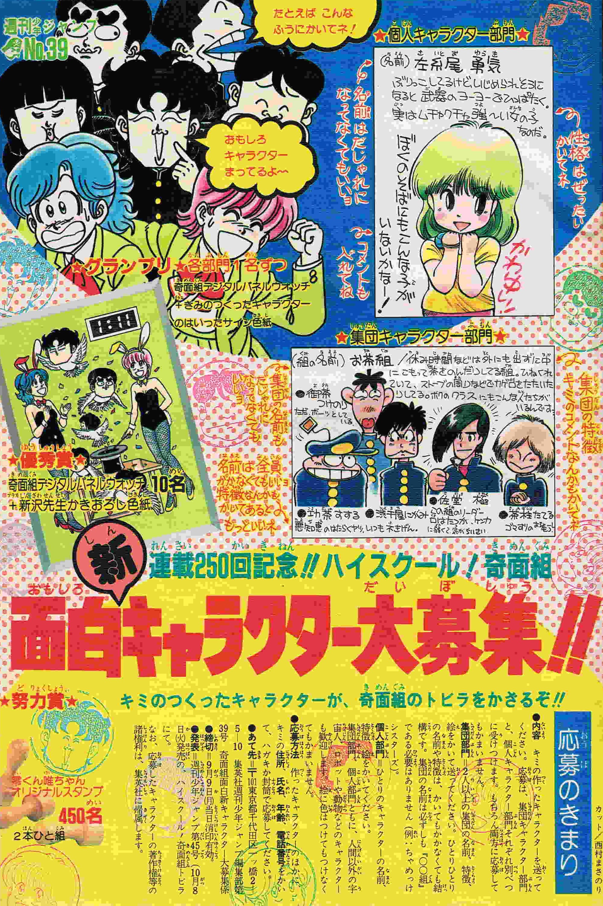 | 45号 | 学園祭変態バザール | 奇面組キャラクター大募集への応募ありがとう、発表は47号からやるよ! | 表紙に奇面組のカラーイラスト少々 |