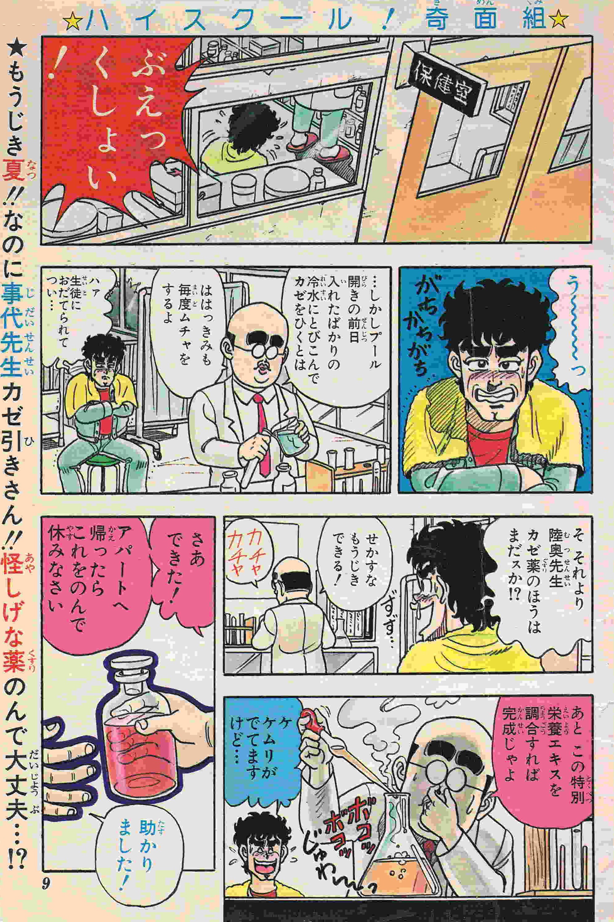 | 2、3号 | ケーハク代講授業 | カゼをひいた。歯もいたい!!でも野菜ジュースでガンバル!! | 表紙に奇面組のカラーイラスト少々 |
